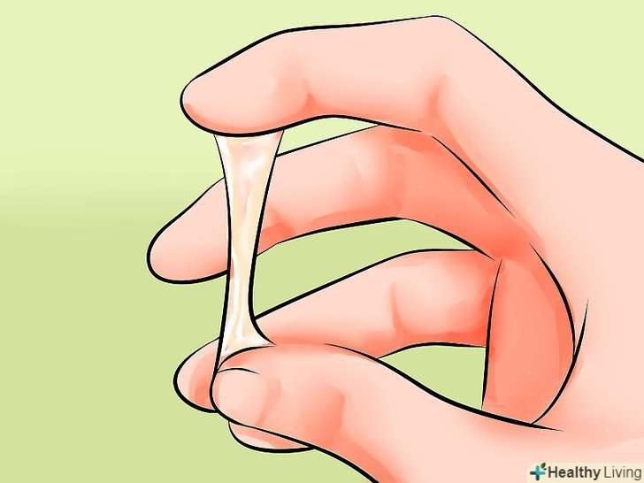 Щоранку досліджуйте цервікальний слиз.почніть перевірку в останні дні менструації. Цервікальна слиз змінюється за кольором, запахом і структурою протягом усього циклу. Перевіряючи її кожен день, ви зможете визначити сприятливі для зачаття дні.[8]- Для перевірки, вимийте руки, потім вставте два пальці в піхву і витягніть.
