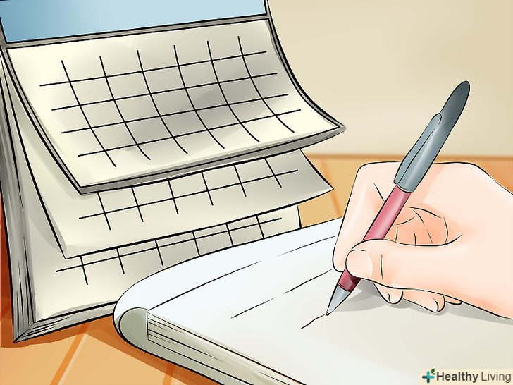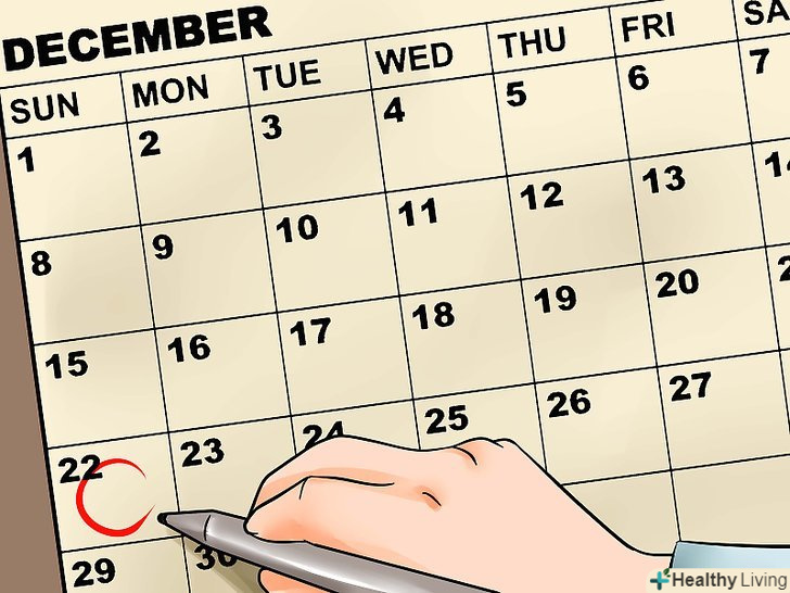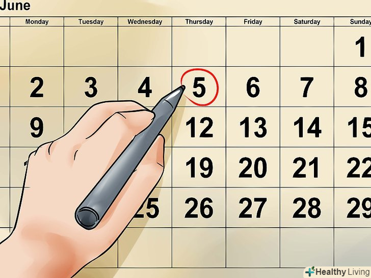 Відзначайте менструальний цикл на календарі.Можете позначати кружечком день початку менструації щомісяця. В кінці кожного циклу, порахуйте кількість пройдених днів.- Порахуйте тривалість, як мінімум 8 циклів, щоб визначити середню тривалість вашого менструального циклу.[10]