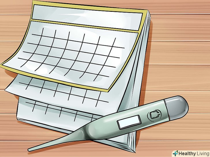 Купуйте базальний термометр.базальною температурою тіла називається найнижча температура організму протягом 24 годин. Відразу після овуляції спостерігається незначне підвищення базальної температури тіла. Моніторинг базальної температури тіла протягом тривалого часу дозволить визначити точний початок фертильного періоду. Базальні термометри можна купити в будь-якій аптеці.- При покупці термометра важливо орієнтуватися на здатність останнього фіксувати найменші зміни температури тіла. Звичайний термометр, яким ви міряєте температуру тіла при хворобі, може не підійти.[4]