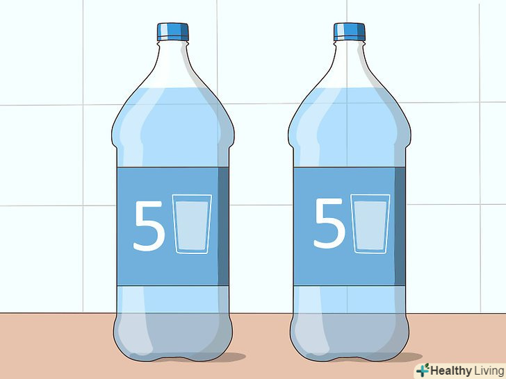Вранці наповніть собі кілька пляшок води на весь день.Один з найбільш зручних і простих способів відстежувати свій питний режим-це набрати з ранку кілька пляшок води, за обсягом приблизно рівних тому обсягу, що необхідно випити за день. Таким чином, вам буде набагато простіше відстежувати, скільки води та інших напоїв ви випиваєте за день.[4]- Можна просто налити води в якусь велику ємність, обсяг якої відповідає рекомендованому об'єму води, який потрібно випивати в день, і регулярно наливати собі трохи води з цього контейнера.