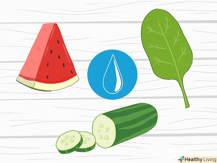 Споживайте більше овочів і фруктів, в яких міститься велика кількість води.наприклад, в таких фруктах, як кавун, міститься велика кількість рідини. Деякі овочі (наприклад, шпинат, огірок) є багатими джерелами води. Таким чином, споживання достатньої кількості цих овочів і фруктів допомагає підтримувати водний баланс в організмі.[5]