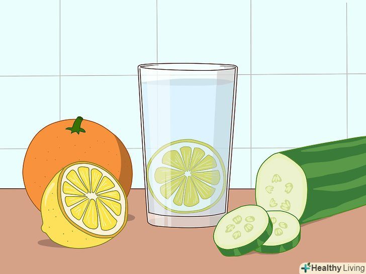 Збагачуйте воду різними смаками.якщо вам не подобається смак звичайної води, можна самостійно надати їй смак і аромат. Наприклад, можна додати в склянку води скибочку лимона або апельсина. Якщо хочете, можна навіть додати туди парочку шматочків огірка або імбиру — це додасть воді новий присмак.