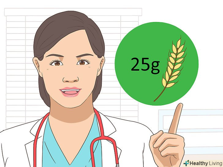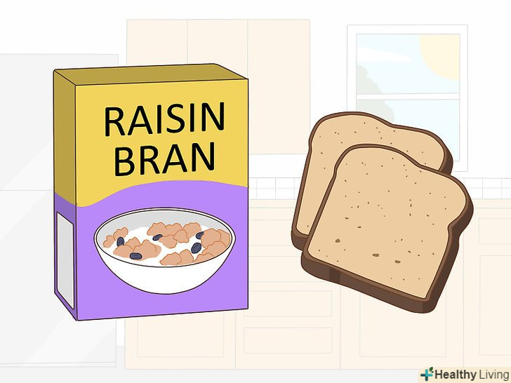 Включіть в свій раціон харчування цільнозернові продукти.цільнозернові-також відмінне джерело клітковини. Наприклад, в порції мюслі або кукурудзяних пластівців (приблизно 180-200 г) міститься 5 г клітковини. А в двох шматках пшеничного хліба міститься 3,2 г клітковини.[10] ще один спосіб забезпечити свій організм клітковиною-приготувати і з'їсти 240 г ячменю, в якому міститься 9 г клітковини.[11]