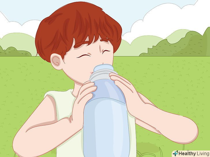 - Не розцінюйте прохання дитини про те, що він хоче пити, як перша ознака зневоднення. Жага, насправді, не є показником.[18] зберігайте в доступному для дітей місці воду та інші напої, які підходять для вживання у відповідний час року. Якщо у дитини сталася значна втрата рідини або інтенсивне потовиділення, витрете з нього піт і поповните запас мінеральних речовин, давши йому випити спортивний напій або пероральний розчин електроліту "Pedialyte".