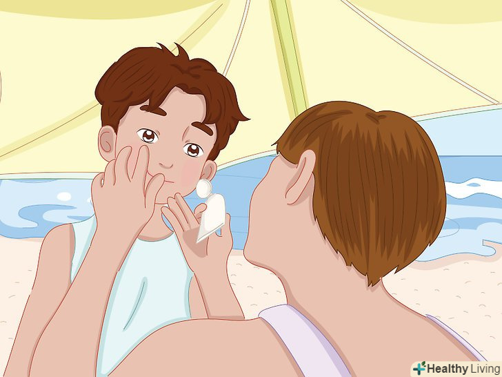 Нанесіть сонцезахисний крем і уникайте прямих сонячних променів.цуратися Сонця необхідно не тільки для того, щоб дітям було прохолодно. Це вбереже шкіру від шкідливих ультрафіолетових променів і запобіжить виникненню сонячних опіків, які дуже шкідливі для них.[19]- Дитина повинна використовувати сонцезахисний крем протягом усього року, і навіть взимку, в якості одного із способів захисту від сонця. Використовуйте крем з рівнем захисту шкіри SPF не менше 30.