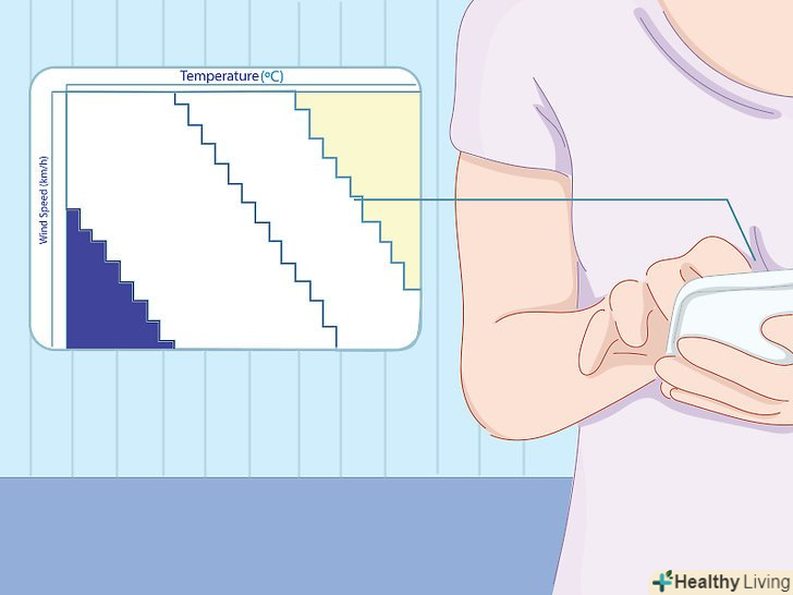 Перевірте погоду на "ощущаемую температуру".через те, що температура повітря не завжди відображає реальні відчуття нашого організму, складно відразу вирішити, чи варто відпускати дітей гуляти, тому що існують і інші фактори, що впливають на тепло і холод, особливо це стосується вологості повітря і переохолодження під впливом вітру. Величина, яку ми хочемо отримати, називається "відчутною температурою". Після того, як ви проведете розрахунки для вітру і вологості, це число покаже реальний коефіцієнт того, наскільки нам буде жарко або холодно на вулиці.[8]- Переохолодження відбувається під впливом вітру і з'являється внаслідок дії відчутної температури в холодну погоду. Ми відчуваємо істотне зниження температури повітря відкритими ділянками шкіри. Метеорологи обчислюють вітро-холодовий індекс за допомогою складних формул. Проте, в Інтернеті ви можете знайти графіки або калькулятори, які прорахують все за вас. Вам необхідно знати тільки температуру повітря і швидкість вітру. На графіку буде відображений фактор переохолодження під дією вітру протягом дня.[9]