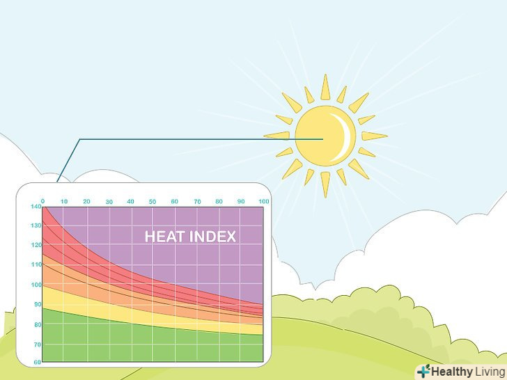 Обчисліть зони підвищеної небезпеки, дізнавшись індекс тепла.як і в першому випадку, перевірте, яка відчутна висока температура небезпечна і безпечна для здоров'я. Розглянемо наступний приклад: якщо відносна вологість становить 70%, температура повітря в 32ºC відчувається як 36ºc, а при відносній вологості в 80%, температура повітря в 35ºC відчувається як 45,5 ºC.[13] Тут обидві відчутні температури небезпечні для здоров'я.- Не втрачайте з уваги сонячне світло. Глобальний вплив сонця підвищує індекс тепла на 9ºC. І тепловий індекс в 36ºc відчувається як 44,5 ºC.