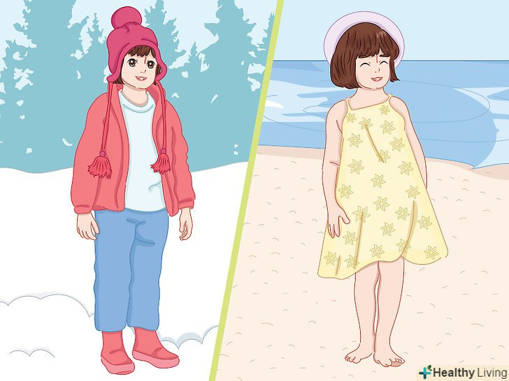 Одягайте дітей відповідно до погоди.ви повинні планувати гардероб згідно з жаркими або холодними погодними умовами. Одягайте дітей пропорційно їх запланованого проведення часу. Для зимової прогулянки необхідно надіти пальто або зимовий комбінезон, рукавиці, шарф, шапку і чоботи. Необхідно надягати багатошарові наряди при середній температурі, а легкі для спекотної погоди.- При виборі гардеробу в холодну погоду зупиніться на багатошаровому одязі. Рухливим дітям дуже швидко стане жарко, навіть якщо на вулиці мороз. Проблема полягає в тому, що вони почнуть потіти, їм стане незручно через відволожилася одягу, а тіло позбудеться тепла набагато швидше, що призведе до ризику гіпотермії. Одягайте дітей таким чином, щоб вони могли зняти важке пальто, якщо спітніли.[14]