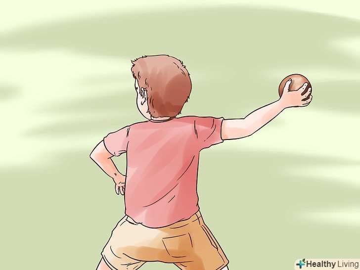 Навчіть дитину кидати.використовуйте м'який м'яч, щоб ніхто не постраждав. Розкажіть дитині що робити:- Потрібно тримати м'яч правою рукою і виставити протилежну ногу вперед.