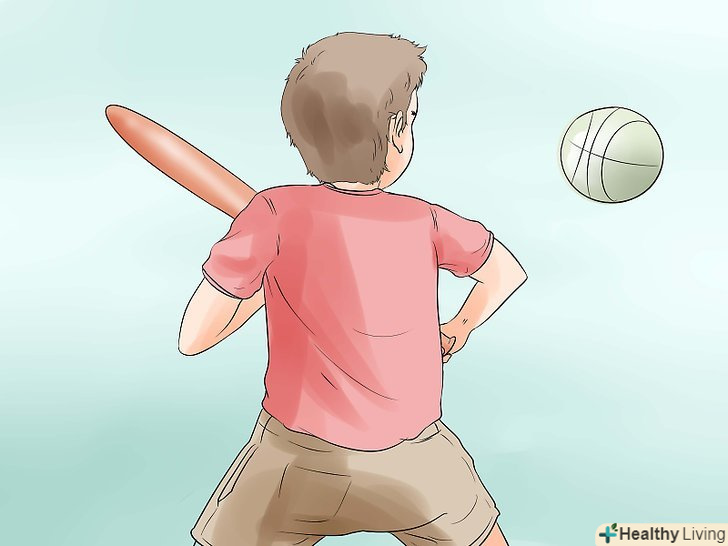 Вчіть кидати за допомогою великого м'яча.Дайте дитині пластикову біту, яка підходить його віку. Почніть з пляжного м'яча і поступово вибирайте м'ячі поменше. Як тільки дитина освоїться з тенісним м'ячем, навчіть його відбивати м'яч звичайною битою.