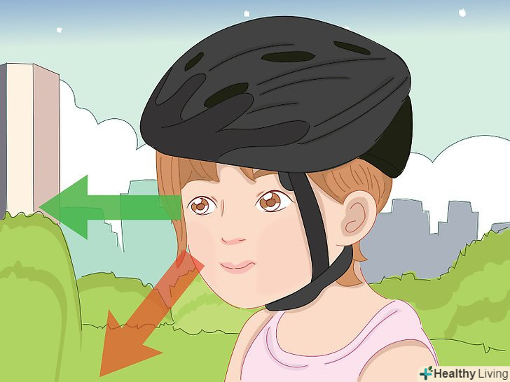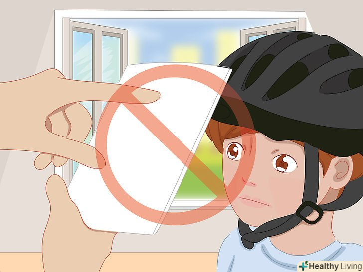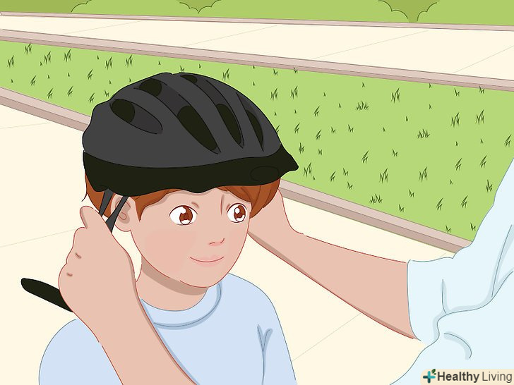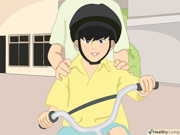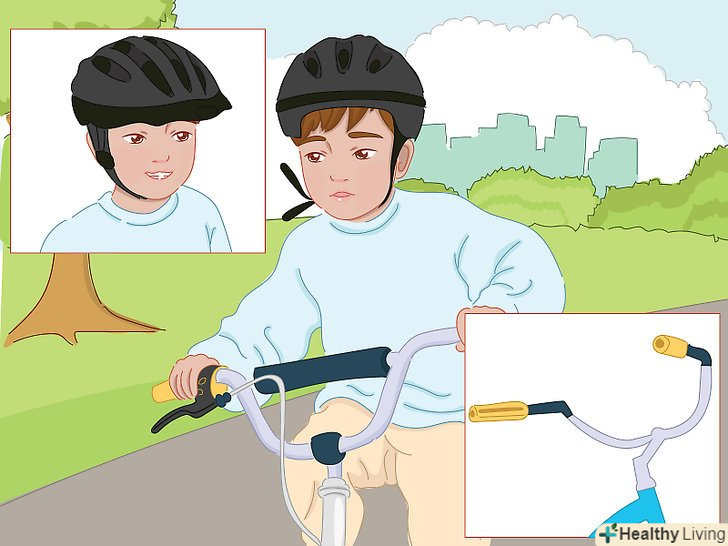 Використовуйте шолом та інше захисне спорядження відповідного розміру.купуйте дитячу модель велосипедного шолома. Він повинен щільно сидіти на голові, а відстань від брів до переднього краю не повинно перевищувати ширини двох пальців.[6]- Також використовуйте дитячі наколінники і налокітники. Рукавички допоможуть захистити долоні від подряпин при падіннях.