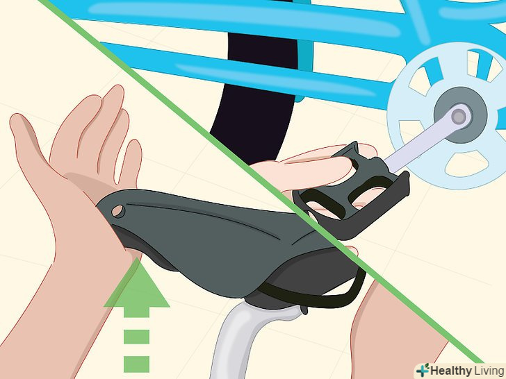 Трохи опустіть сидіння, щоб дитина могла відштовхуватися ногами від землі.при звичайній їзді важливо, щоб велосипедист діставав до землі тільки прямими ногами, але для їзди без педалей ноги повинні бути трохи зігнуті в колінах.[7]- Зазвичай висоту сидіння регулюють за допомогою гайкового ключа, а деякі велосипеди мають швидкороз'ємний механізм.
