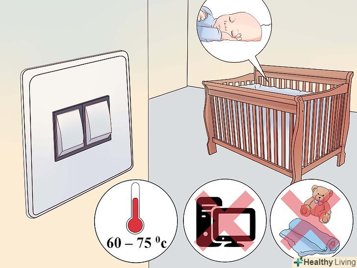 Створіть відповідне середовище для міцного сну малюка.облаштуйте кімнату, яка підходить для сну і розслаблення вашої дитини. Сприятлива температура, хороша шумоізоляція і приглушене світло допоможуть вашій дитині заснути.[15]- Оптимальна температура в кімнаті повинна становити 18-23 градуси.[16]