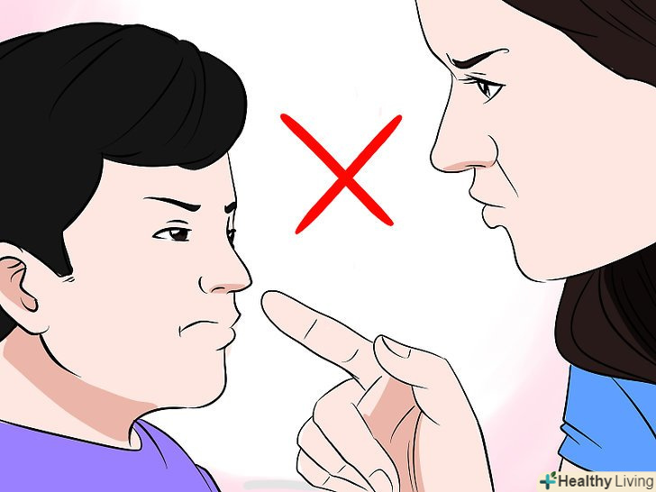 Не підвищуйте голос.за даними досліджень, крик на підлітка, яким би заслуженим він не був, тільки посилює погану поведінку.[1] Вилаявши дитину, ви можете ненадовго відчути себе краще, але без роботи над поліпшенням його поведінки ви мало чого досягнете. Як би важко вам не було, навіть якщо підліток кричить на вас, не дозволяйте собі підвищувати на нього голос у відповідь.