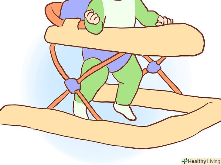 Навчіть дитину, як переміщатися в ходунках.навчитися стояти в ходунках-це лише половина завдання. Для того щоб це було цілеспрямовано, дитині все ще потрібно навчитися переміщатися в цьому пристосуванні.- Для більшості початкові рухи досить випадкові. Хвилювання змушує діток махати ногами, і цей рух штовхає ходунки в дію. Тим не менш, деяким дітям все ще може знадобитися допомога в тому, щоб рухати ходунки.