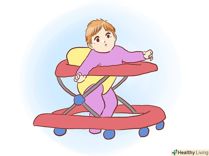 Врахуйте, що ваша дитина може стати залежною від ходунків для підтримки.Одним з недоліків використання ходунків є ймовірність стати залежним від підтримки, яку вони дають, коли малюки падають. В результаті, дитина не зможе відчути себе досить безпечно, щоб стояти і ходити, коли не буде перебувати в ходунках.- Це може затримати здатність дитини ходити самостійно. Цілком можливо, що використання ходунків стане причиною більш повільного розвитку ніжок дитини, так як діткам не потрібно тримати свою повну вагу в ходунках.