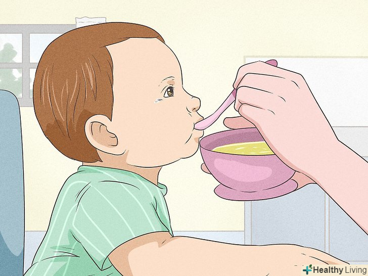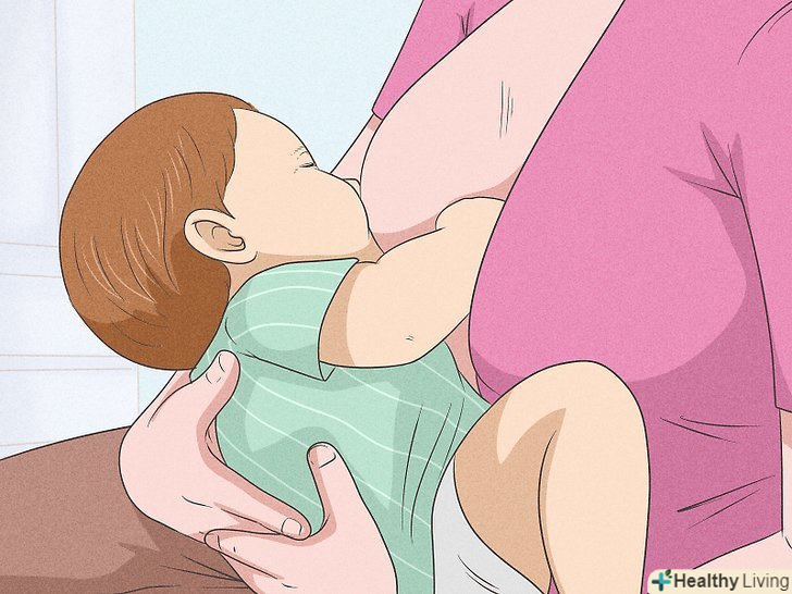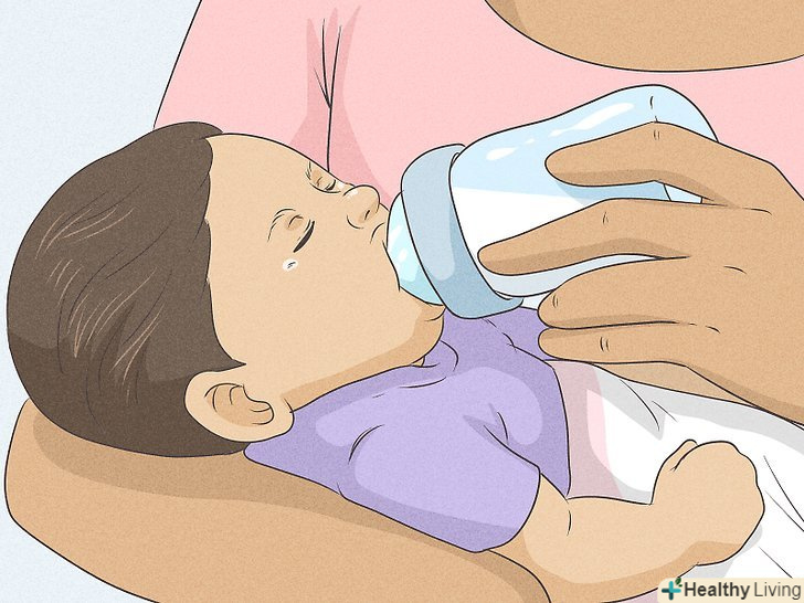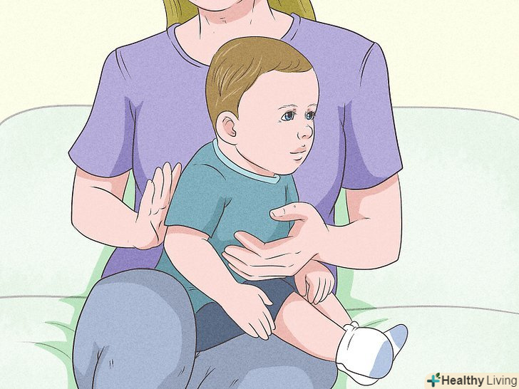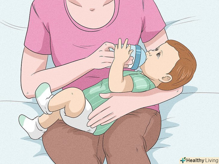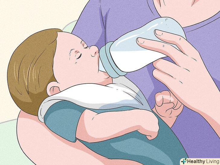 Посадіть дитину собі на стегно.не забудьте про те, що потрібно підтримувати голову і шию малюка.[1] Можете накрити себе і дитину пеленочкой на випадок, якщо малюк відригне їжу.- Підтримуйте дитину спереду за груди руками, а шию і голову — пальцями. Це дозволить переконатися в тому, що дитина знаходиться в безпечному положенні і що ви весь час підтримуєте верхню частину його тулуба