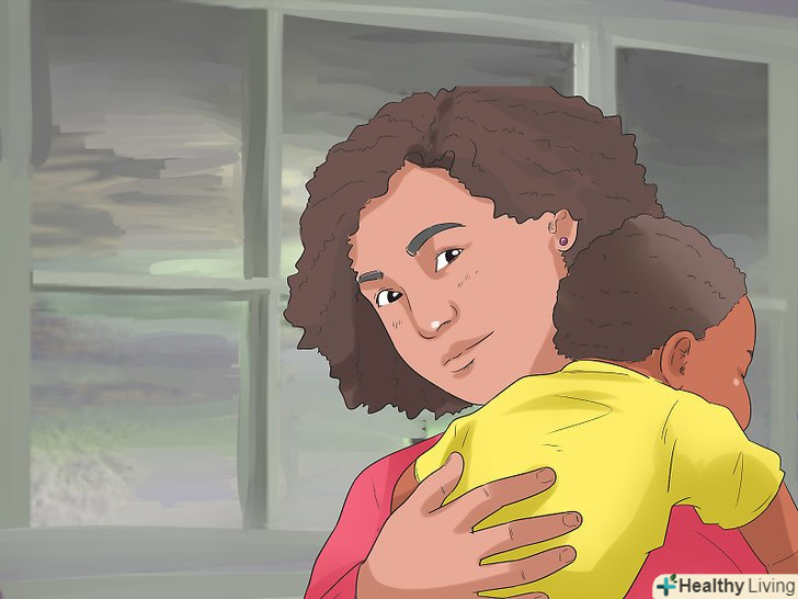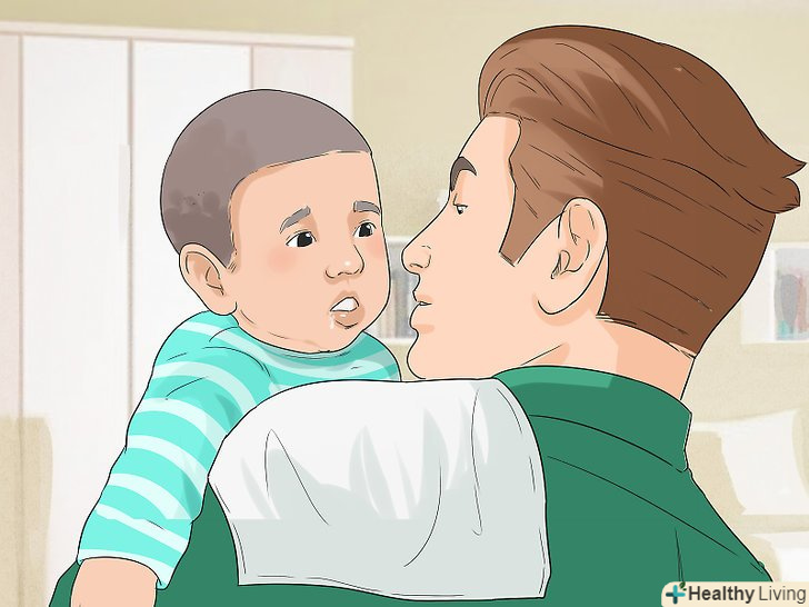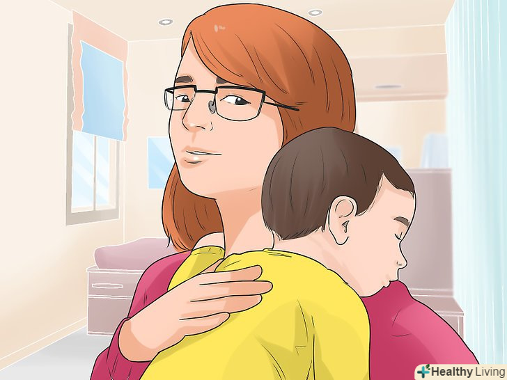 Легенько натисніть плечем на живіт дитини.прикладіть дитину до грудей і плеча, але при цьому досить високо, щоб плече злегка впиралося дитині в живіт. Це допоможе спустити накопичився в стравоході повітря. Обережно потріть спинку дитини, поки тримаєте його іншою рукою.[2]- Простежте за тим, щоб малюк не перегинався через плече занадто сильно і був в змозі нормально дихати.