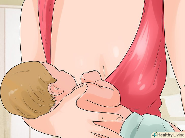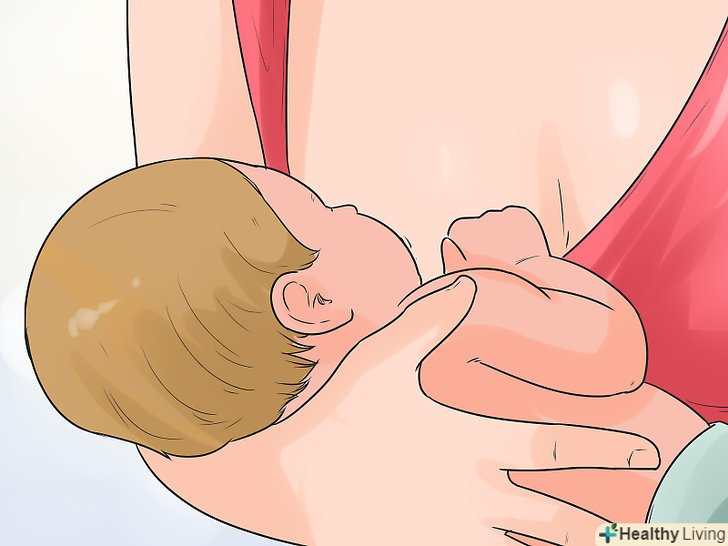Правильно розташовуйте дитину для годування.щоб дитина рясно не заковтував повітря при годуванні, важливо правильно розташовувати малюка, тоді він зможе щільніше присмоктатися до грудей або соски. Постарайтеся посадити малюка і годувати його під кутом близько 45 градусів або більше. Також слід притримувати вагу своїх грудей, даючи дитині впевнено присмоктатися до неї, замість того щоб він був змушений відхилятися від важкої грудей. Так малюк щільно присмокчеться до грудей, що знизить обсяг повітря, який дитина заковтує з молоком.[13]