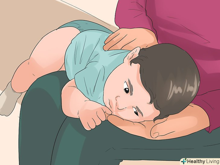 Покладіть малюка на живіт.покладіть дитину собі на коліна обличчям вниз і перпендикулярно вашому тілу. Однією рукою підтримайте підборіддя малюка, а інший — злегка поплескайте його по спинці.[4]- Тримайте голову малюка вище рівня решти тіла, щоб не викликати зайвого припливу крові до голови.