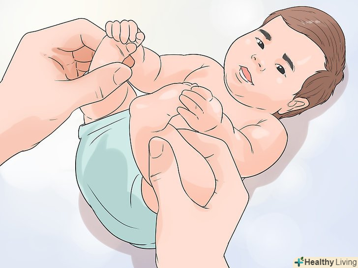 Притягніть коліна дитини йому до грудей.якщо дитина вередує, можливо, йому потрібно випустити гази і з кишечника. Щоб допомогти малюкові, покладіть його на спину і повільно притягніть коліна йому до грудей. Це дозволить випустити гази як через рот, так і з кишечника (але здебільшого з кишечника).[5]
