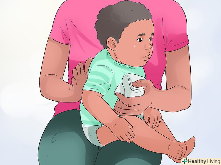 Викличте відрижку у сидячої дитини.посадіть малюка собі на коліна обличчям від себе. Підхопіть долонею підборіддя дитини, а підставою цієї ж долоні упріться йому в груди. Іншою рукою обережно поплескайте малюка по спинці, поки він не відригне.[3]- Перевірте положення підтримуючої руки. Переконайтеся в тому, що ви не тримаєте малюка за горло і не утрудняєте йому дихання.