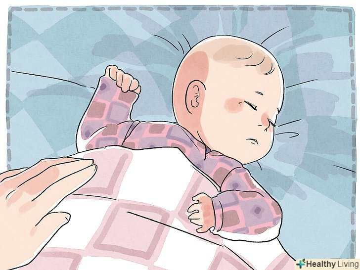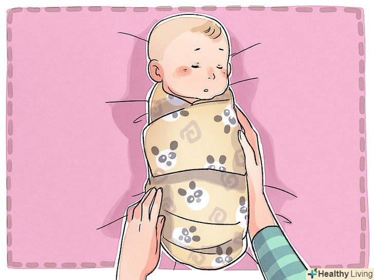 Сповити вашого малюка.сповивання-це відмінний спосіб заспокоїти дитину; тому що малюк відчував себе комфортно, в теплі, коли був в утробі матері, а сповивання допоможе вам імітувати це почуття безпеки. Використовуйте для цього м'яку ковдру. Щільно укутайте вашого малюка, щоб він не турбував себе рухами руками і ногами. Щоб уберегти дитину від СВСМ або від проблем з диханням, важливо переконатися, що ви сповили дитини не дуже туго, і потрібно покласти його на спину; чи не сповивайте малюка з соскою, щоб уберегти його від задухи, щоб дитина могла нормально дихати. Ось як потрібно сповивати дитину:[3][4]- Постеліть ковдру на рівну поверхню.