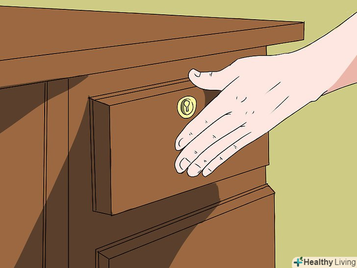 Закрийте всі шафки.Запрячьте всі шкідливі речовини і побутову хімію, ліки і миючі засоби, також переконайтеся, що всі шухлядки закриті для дитини. Ви можете закрити шафки звичайними дужками, що зробить відкриття шафки неможливим для дитини і легким для дорослого.- Також ви можете використовувати магніти, щоб з'єднувати дверцята шаф, Ви також можете його прибирати, коли дитини немає поруч. Відвідайте місцевий магазин або магазин з речами для дітей, щоб вибрати такий замок.