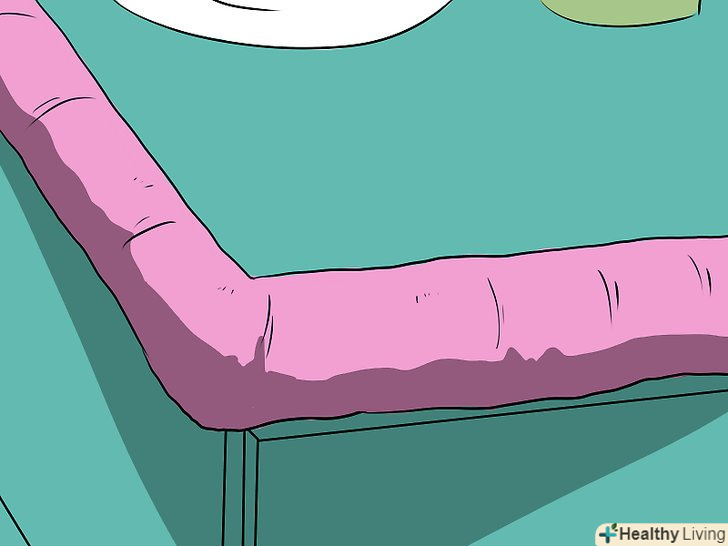 Будьте уважні з гострими кутами меблів.додайте прокладки на гострі кути, які часто знаходяться на рівні голови, видаліть або переставте небезпечні речі. Меблі, зроблена з особливого матеріалу, скла або каменю, особливо небезпечна. Гумові прокладки для меблів можна купити в магазині; просто прикріпіть їх на небезпечні поверхні.- Ви також можете зробити свої власні ватяні або вовняні прокладки, скласти їх навпіл і накрити кути.