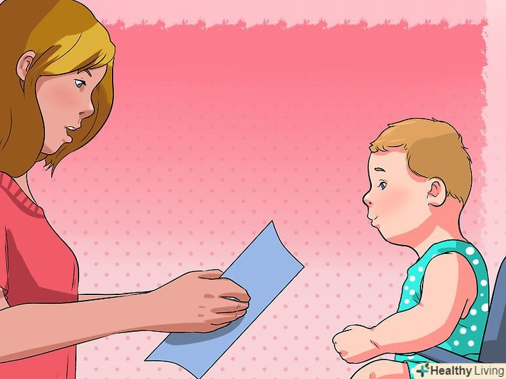 Читайте вголос.купуйте дитячі книги і читайте їх малюкові регулярно. Ваша дитина не зможе зрозуміти все відразу, але механізми в голові малюка почнуть обертатися. Слуховий аспект цієї діяльності спонукає вашу дитину лепетати, в той час як візуальний аспект може спонукати вашого малюка проявляти більше інтересу до читання в більш старшому віці.- Переконайтеся, що ви вибираєте книги відповідно до віку вашої дитини. На цьому етапі найкращі книги-це ілюстровані книги з яскравими кольорами та контрастами. Слова повинні бути простими і легкими для розуміння.