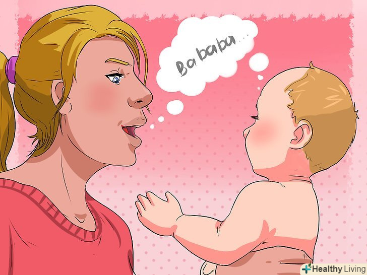 Не припиняйте говорити.говоріть зі своїм малюком якомога частіше, навіть якщо ви не підтримуєте активну бесіду з ним. Немовлята мають схильність наслідувати і, якщо вони чують Ваш голос постійно, це може спонукати їх частіше видавати власні звуки.- Говоріння заохочує як мову сприйняття, так і мову вираження. Мова сприйняття-це здатність розуміти мову, Мова вираження — здатність виробляти мову.[5]