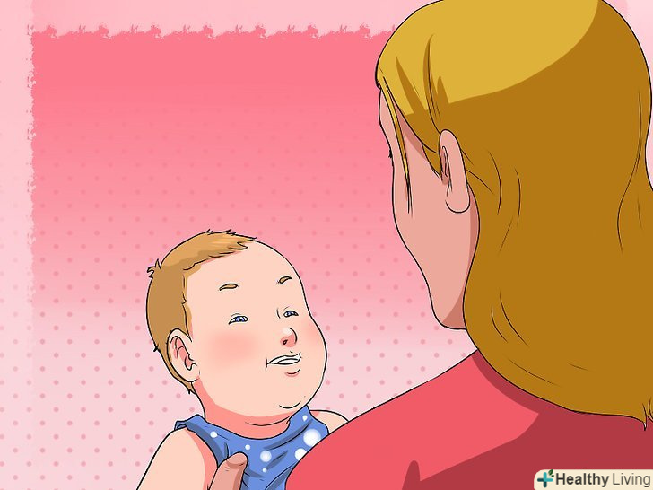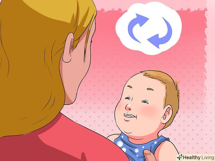 Давайте назви.немовлята від природи цікаві, вони хочуть знати все про світ навколо них. Давайте назви речей навколо вашої дитини, вказуючи на них і повторюючи назву цього об'єкта. Це може допомогти зацікавити дитину повторювати ці назви, що може сприяти подальшому розвитку навичок мовлення.- Почати давати назви краще з частин тіла. Вкажіть на носик вашого малюка і скажіть «ніс». Вкажіть на ручку і скажіть «рука». Більшість дітей цікаво дізнатися про свої власні органи, і опис тіла буде стимулювати вашого малюка лепетати, наслідуючи ваші описи.