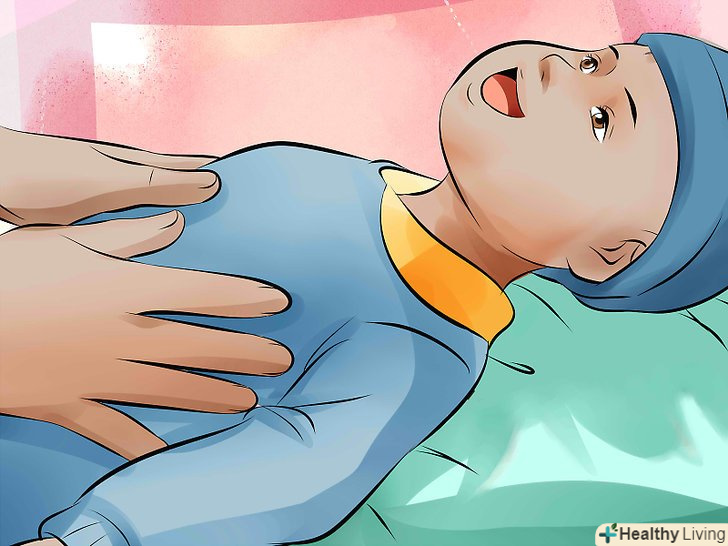 Тримайте новонародженого.ви повинні переконатися, що завжди притримуєте головку і шию дитини. Іноді ви повинні дозволити дитині відпочити, поклавши його голову на внутрішню сторону ліктя, а тіло повинно лежати на другій руці. Його зовнішнє стегно і нога повинні відпочивати разом з вашою рукою, яка лежить на його грудях і животику. Тримайте дитину міцно і приділяйте йому всю свою увагу.[3]- Ви також можете тримати дитину, поклавши його животик собі на груди, використовуючи руку, щоб притримувати його. Другу руку використовуйте для того, щоб підтримувати голову дитини.