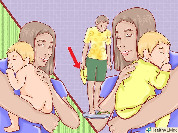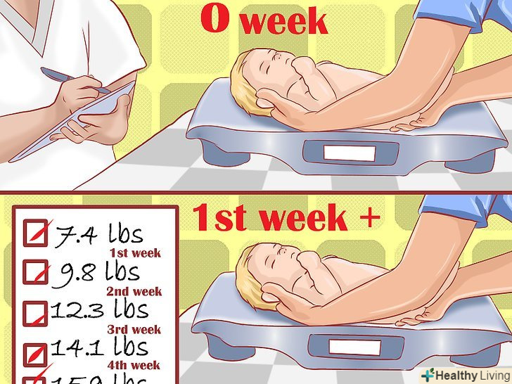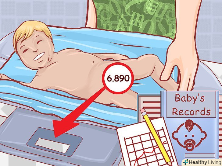 Зважте дитину.покладіть малюка на ваги, бажано без одягу. Тримайте руки над дитиною, але не кладіть їх на чашу. Так ви зможете зловити малюка, якщо він зісковзне. Подивіться його вага і запишіть в блокнот. Слідкуйте за збільшенням або втратою ваги. Коливання в показниках можуть відбуватися досить часто, тому необхідно зважувати дитину кожні два тижні, щоб бути в курсі збільшення або втрати ваги.[4]- Не турбуйтеся про короткострокові надбавки або втрати у вазі, якщо ваша дитина не виглядає хворим і не відчуває проблем з годуванням. В іншому випадку проконсультуйтеся з лікарем.