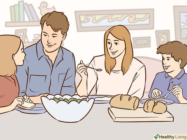 Вечеряйте як сім'я.одна з найнебезпечніших тенденцій в сучасній сім'ї-відсутність традиції сімейних вечерь. Обідній стіл не тільки місце для прийому їжі, але і місце для навчання і передачі ваших цінностей. Манери і правила легко сприймаються за столом. Сімейні вечері допомагають передавати і підтримувати ідеали, які діти пронесуть через все життя. [2]- Якщо ваша дитина вибаглива в їжі, не проводьте вечерю, критикуючи харчові звички дитини і контролюючи, що він їсть. Це призведе до того, що у вашої дитини будуть негативні асоціації, пов'язані з сімейними вечерями.