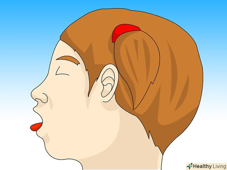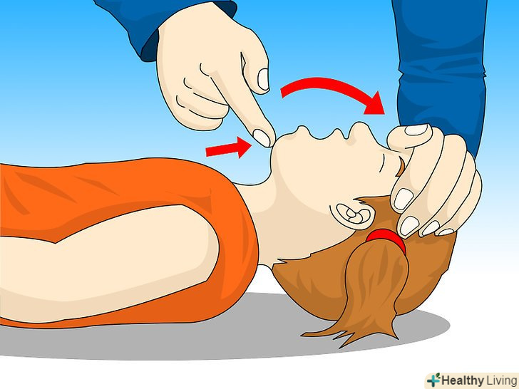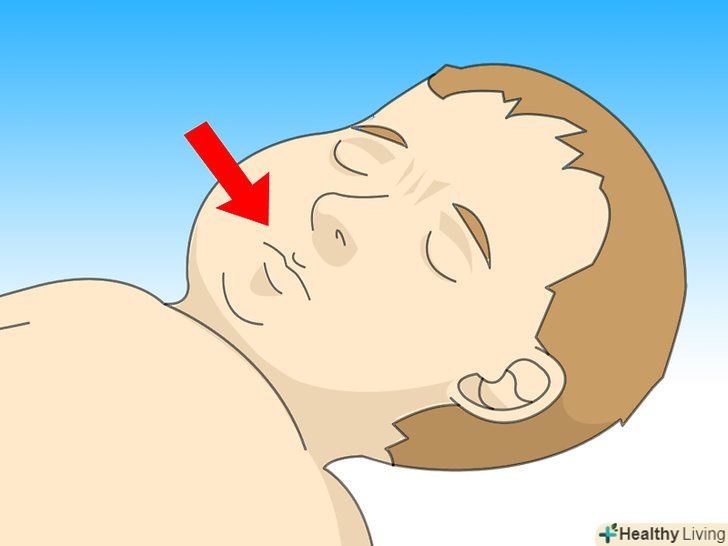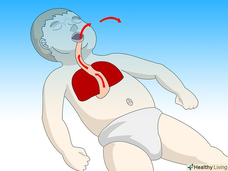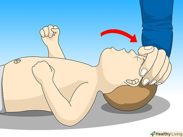 Відкрийте дихальні шляхи дитини.це можна зробити таким чином: однією рукою закиньте голову дитини трохи назад, а іншою рукою підніміть підборіддя. Чи не закидайте голову дитини назад занадто сильно, потрібно зовсім небагато зусиль, щоб відкрити дихальні шляхи маленької дитини.[1]