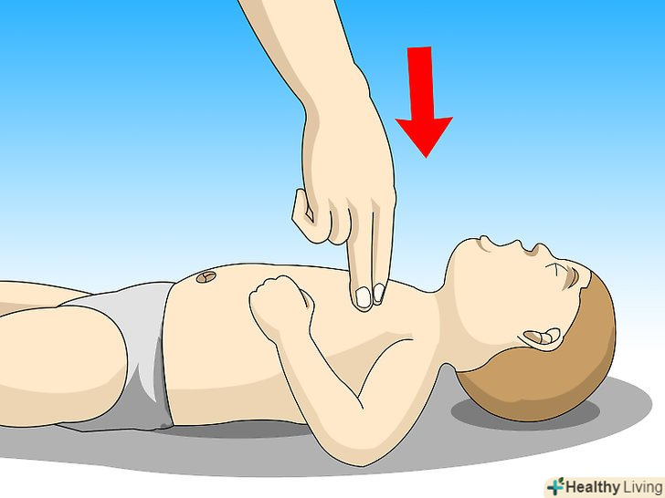 Виконайте тридцять натискань на груди.після того як ви зробите штучне дихання, залиште дитину лежати на спині і використовуйте ту ж техніку, яку використовували раніше для натискання на груди - тобто, використовуючи два або три пальці твердо втисніть груди дитини приблизно на 3,5 сантиметра.[1]- Натисніть прямо вниз на грудну кістку дитини в центрі грудей дитини, трохи нижче сосків.