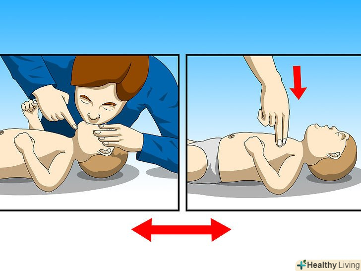 Чергуйте два штучних вдиху і 30 натискань на груди, так довго, як це необхідно.повторіть послідовність з двох штучних вдихів з наступними тридцятьма натисканнями на грудну клітку, поки дитина не почне дихати знову або не прибуде Швидка медична допомога.[4]
