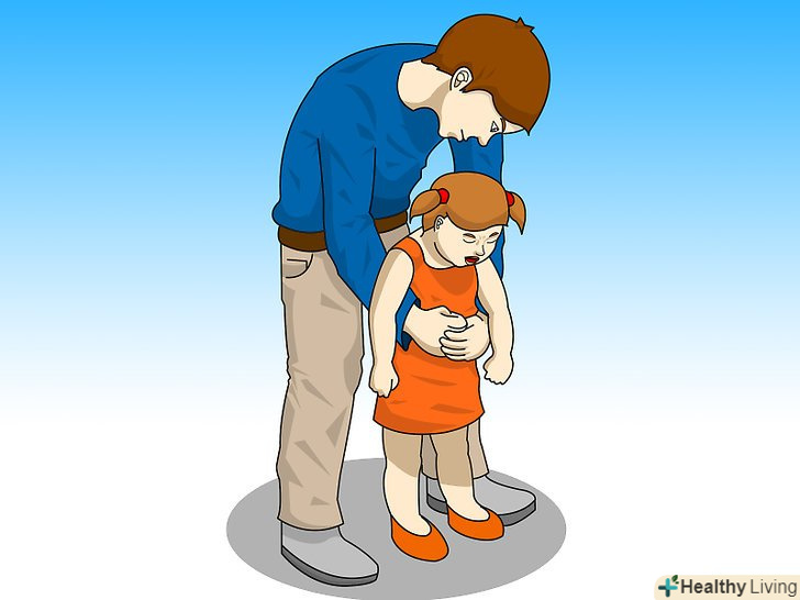 - Обійміть вашої другою рукою кулак і швидко натисніть вгору і всередину на живіт дитини. Цей рух повинен змусити повітря разом з будь-якими, застряглими предметами вийти з трахеї.[7]