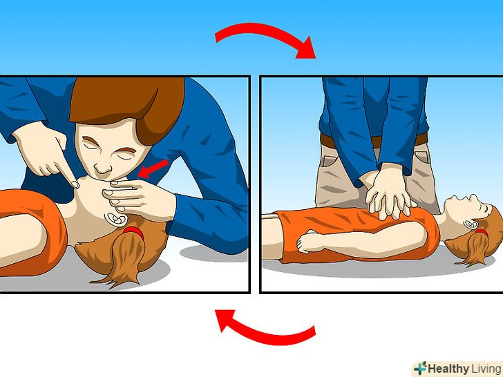- Якщо ви перебуваєте з дитиною наодинці, насамперед приступите до надання першої невідкладної допомоги. Проведіть її протягом двох хвилин, а потім зупиніться і зателефонуйте в швидку допомогу. Продовжіть надавати допомогу, поки не приїде швидка допомога.[1]