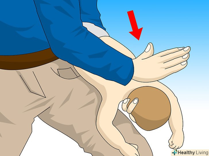 Зробіть п'ять прекордіальних ударів.такі удари змушую повітря вийти з дитячих легенів, чого може бути достатньо, щоб сторонній предмет вийшов.[5] щоб зробити натискання на груди дитині, якій менше року:- Покладіть два або три пальці в центр грудей дитини, прямо під сосками.[5]