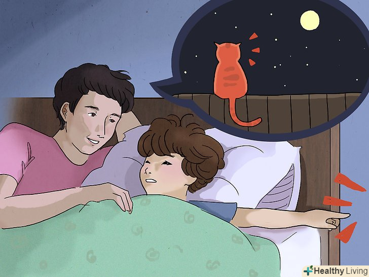 - Можливо, вам допоможе план, складений на випадок вашої відсутності. Наприклад, коли дитина прокинеться від кошмару. Ви можете навчити дитину технікам релаксації, таким як глибоке дихання (попросіть дитину уявити, що його легені – це кулька, який потрібно спочатку надути, а потім відпустити), або візуалізації (дитина може уявити, що знаходиться в тихому і спокійному місці, наприклад, що він пливе на хмарах).[4]