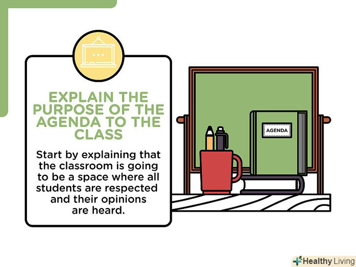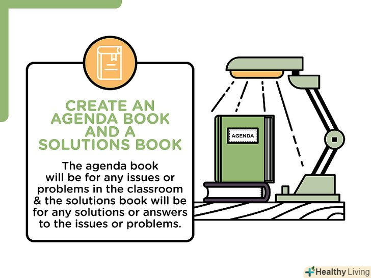 У перший же день занять поясніть призначення записної книжки зі списком завдань.Покажіть учням обидві записні книжки в перший день занять. Почніть з пояснення того, що Кабінет класу є тим місцем, в якому поважають всіх учнів і прислухаються до їхньої думки. Також повідомте про те, що протягом навчального року при вирішенні певних питань і проблем ви будете спиратися на колективну думку класу. Скажіть, що ви будете цілком сприяти класним обговоренням, але при цьому очікувати від учнів того, що вони будуть самі прагнути обговорювати виникаючі питання і приймати свої власні рішення.[15]- Як приклад ви можете продемонструвати учням одну із завдань, яка стояла перед іншим класом в минулому році і була занесена в записну книжку із завданнями. Наприклад, можна обговорити проблеми, які виникали в учнів при побудові класу перед відвідуванням їдальні. Деякі учні штовхалися і заважали один одному, коли було необхідно побудуватися парами.