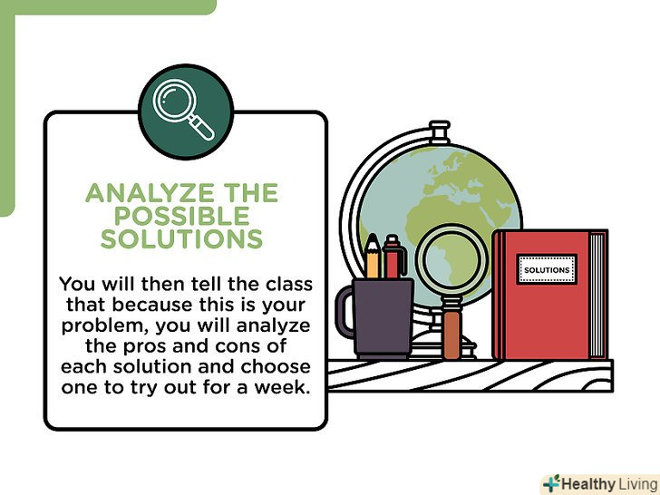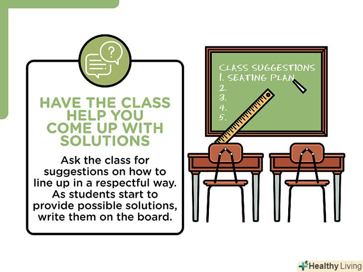 Проаналізуйте різні варіанти рішень. вам необхідно повідомити класу, що поведінка учнів є проблемою вчителя, тому саме ви проаналізуєте плюси і мінуси кожного із запропонованих рішень і виберете один з варіантів, щоб випробувати його протягом тижня. Поясніть учням:"хто піднімає проблемне питання, той і вибирає для нього рішення". Вголос проаналізуйте кожен варіант рішення, щоб весь клас міг зрозуміти ваші обгрунтування.[17]- Наприклад, хід ваших міркувань може бути таким: “якщо я дозволю хлопчикам будуватися перед дівчатками, то дівчатка можуть образитися, але нам цього не потрібно. Якщо я буду викликати учнів в пари в алфавітному порядку, то прізвища на букву " А " завжди будуть першими. Побудова парами на швидкість може призвести до травм і збільшення кількості скривджених учнів. Тому я виберу виклик парт у випадковому порядку".