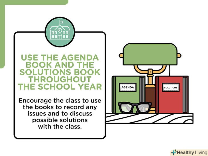 Використовуйте записні книжки для запису виникаючих проблем і їх рішень протягом усього навчального року.тепер, коли ви вже дали учням зрозуміти призначення і сенс записників із завданнями і їх рішеннями, спонукайте їх користуватися ними, щоб записувати будь-які можливі питання і всім класом влаштовувати відкрите обговорення варіантів рішень. Щодня перевіряйте записну книжку з завданнями класу і піднімайте відповідне обговорення.[18]- Запитайте учнів, хто саме записав конкретне питання для обговорення в класі і прийняття по ньому рішення. Як тільки у питання з'явиться 3-4 можливих варіанти вирішення, допоможіть задав питання учневі вибрати з них найбільш підходящий варіант для подальшого застосування на практиці протягом тижня. Попросіть клас підтвердити згоду з обраним рішенням і необхідністю слідувати йому протягом тижня, звернувшись по імені до учня, спочатку підняв питання.