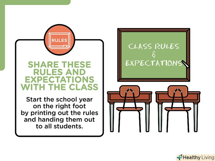 У перший же день занять ознайомте учнів з правилами і висловіть свої очікування щодо їх поведінки.почніть навчальний рік з роздруківки правил, щоб роздати їх усім учням. Правила також можна повісити на шкільну дошку або розмістити в створеній для класу закритій групі в соціальних мережах, щоб вони не загубилися протягом навчального року. Поясніть учням, що ви чекаєте від них дотримання встановлених правил, а також взаємного бажання закріпити виконання цих правил серед однокласників.[5]
