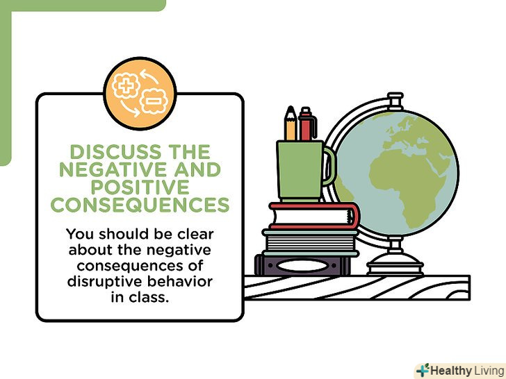 Обговоріть негативні та позитивні наслідки від недотримання або дотримання правил.ви повинні чітко пояснити учням негативні наслідки неналежної поведінки в класі. Наприклад, якщо один учень перебиває іншого учня, коли той відповідає вчителю, це вважається неналежним поведінкою, за яке можна оголосити догану. Також порушенням правил може бути відмова одного учня поділитися чим-небудь (олівцем, ручкою) з іншим учнем, що може привести до зниження оцінки за спільну роботу. Поясніть можливі ситуації, в яких поведінка учнів буде вважатися неналежним або таким, що порушує правила. [6]- Крім того, ви повинні пояснити класу позитивні наслідки від виконання правил, наприклад, у вигляді похвали або участі окремих учнів класу в лотереї за який-небудь приз. Також можна ввести систему зірочок, в якій учень, який дотримується правил, спільно з оцінкою отримує зірочку. Крім того, можуть бути ефективними групові види заохочень. Наприклад, кожен раз, коли учні поводяться добре, добре взаємодіє між собою і дотримуються правил, можна класти в вазу скляну кульку. Якщо кульки у вазі досягнуть певного рівня, весь клас зможе відправитися на якусь екскурсію або взяти участь в якомусь заході.