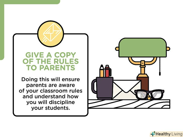 Протягом першого тижня занять надайте роздруківку правил для батьків кожного учня.цим ви повідомите батьків про встановлені в класі правила і використовуваних вами виховних заходи. Якщо який-небудь учень вийде з-під контролю, його батьки також можуть бути залучені до виховних заходів, тому їм буде корисно ознайомитися з правилами поведінки в класі ще в перший тиждень занять.[7]- Батьків можна попросити ще раз вдома опрацювати з дітьми правила поведінки в класі, щоб забезпечити їх повне розуміння. Подібна дія буде також сигналізувати учням про те, що батьки знають і схвалюють встановлені в класі правила.