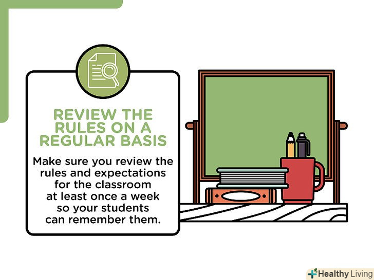Регулярно нагадуйте учням про встановлені правила.діти добре реагують на чесний і послідовний підхід вчителя до учнів, вони часто вчаться на прикладах. Не забувайте раз на тиждень нагадувати учням про правила поведінки в класі, щоб вони краще їх засвоїли. [8]- Крім того, важливо поцікавитися, чи не виникло в учнів яких-небудь питань щодо існуючих правил. Наприклад, учні можуть прийти до висновку, що деякі правила потребують більшої конкретики або в певних поправках. Будьте готові до відкритого обговорення правил і дозвольте учням відкрито висловлювати їхню думку. Незважаючи на те, що ви можете відмовитися коригувати встановлені правила, подібний відкритий підхід буде демонструвати учням, що ви поважаєте їх думку; крім того, так ви зможете оцінити критичне мислення своїх підопічних.