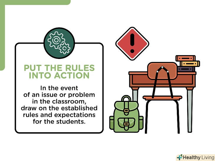 Застосовуйте на практиці встановлені вами правила.у разі виникнення будь-якої проблемної ситуації в класі вдавайтеся до затверджених правил і нагадуйте учням про ваші очікування від їх поведінки. Не бійтеся проявляти строгість, це єдиний спосіб зберегти контроль над поведінкою учнів. Будьте готові призначати належні види покарань, які сприятимуть розвитку самоаналізу і готовності обговорювати проблеми, але не будуть викликати у провинився учня почуття приниження або збентеження.[9]- Крім того, протягом усього навчального року не слід забувати про позитивні види заохочень за дотримання правил поведінки, як окремими учнями, так і класом в цілому. Цим ви будете нагадувати класу, що правила встановлені не тільки для покарання поганої поведінки, але і для заохочення хорошого.